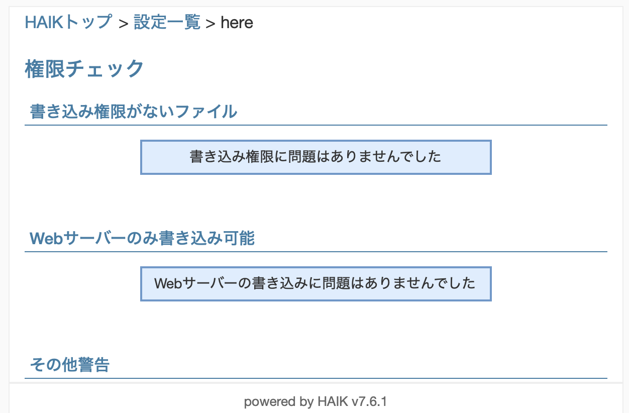 なお、HAIK側の 設定>ファイル権限設定で 「書き込み権限に問題なし」の確認済み。