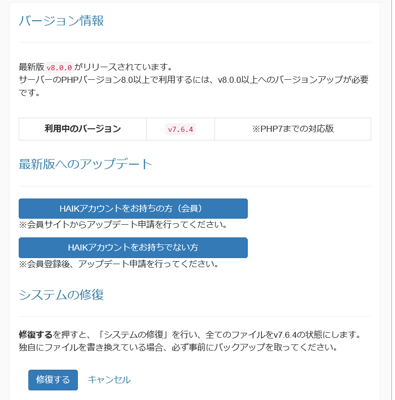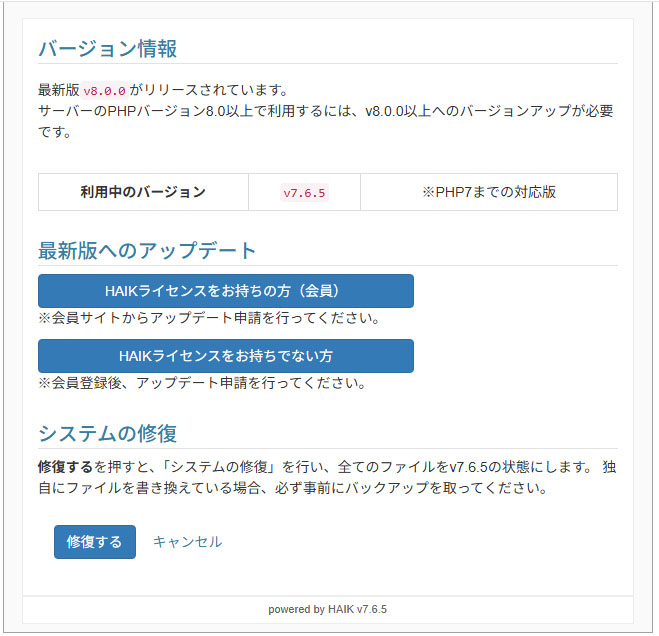 7.6.5では、これ以外の変化はありませんので、PHP8環境でHaikを使いたい場合は、Haik Clubの会員になって8.00にバージョンアップ申請してください。